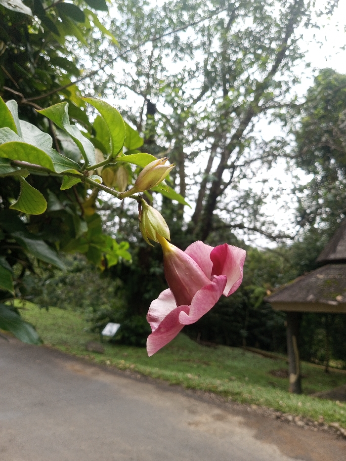 The scene, located in Kanand, India, depicts a close-up view of a single pink, bell-shaped flower with curled petals, suspended from a leafy stem on the left side of the frame. Two green, closed flower buds are visible above the pink blossom on the same stem, amidst dark green foliage. A paved pathway or road runs diagonally across the lower-left quadrant of the image. Adjacent to the path, a green grassy slope extends, featuring a small white rectangular sign partially discernible in the midground. The background consists of a dense natural environment with numerous trees against a bright, likely overcast sky. A dark-roofed, gazebo-like structure is positioned on the right side of the background. No individuals are present.