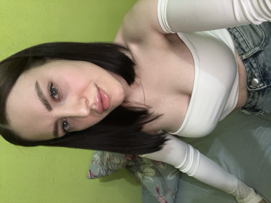 This image depicts a single female subject in a close-up, indoor setting within the city of Rostov-on-Don, Russia. The subject has dark brown, shoulder-length hair and fair skin. Her eyes are light-colored, and her lips appear full with a glossy finish. She wears a white, off-the-shoulder, long-sleeved crop top and light blue distressed denim jeans. A thin, gold-colored necklace with a small pendant is visible around her neck. The subject is positioned facing forward, looking directly into the camera. The background features a solid lime green wall. To the left of the subject, a patterned cushion with floral motifs in blue, pink, and green is partially visible, resting on a light blue or teal surface, possibly a sofa or bed. The lighting is consistent and direct.
