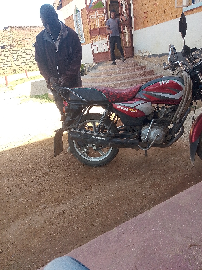 The scene depicts an outdoor setting in Kakamega, Kenya, featuring two individuals and a motorcycle. A red, black, and silver TVS Star Sport motorcycle is centrally positioned on reddish-brown dirt ground, angled with its right side visible. The motorcycle features "TVS" branding on the fuel tank and "Star Sport" on the side panel, a patterned red and black seat cover, and a dark cloth draped over the handlebars. An adult male, wearing a dark jacket and trousers, is positioned behind the motorcycle on the left, leaning forward as if manipulating the rear luggage rack or fender. His face is obscured. In the background, a younger individual in a grey t-shirt and dark trousers is captured mid-stride, stepping out from an open doorway at the top of a series of concrete steps belonging to a brick-colored building. The building has a white base and an ornate metal door with cross designs and colored glass inserts. A light-colored brick wall is partially visible in the far left background. The overall lighting suggests daylight conditions.