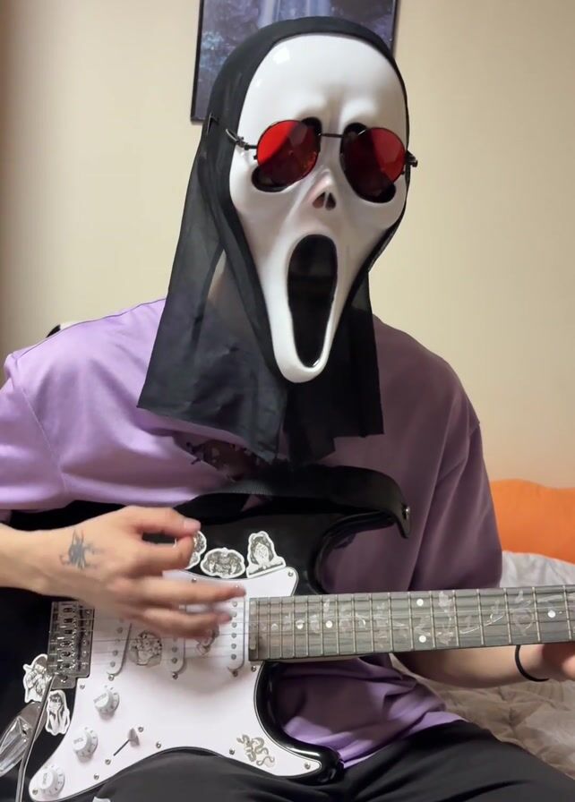A person wearing a Scream mask and red sunglasses, and a purple t-shirt is sitting on a bed and playing an electric guitar