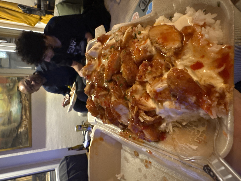 An indoor scene in Palaiseau, France, depicts two males eating takeout food, observed from the perspective of a third individual holding a food container. In the immediate foreground, a white styrofoam container is filled with a large portion of white rice topped with numerous pieces of fried or breaded chicken, heavily coated in a creamy white sauce and a reddish-orange chili sauce with visible herbs. A clear plastic fork rests partially in the container. In the mid-ground, to the left, an adult male with short or bald hair, wearing a dark blue shirt, looks rightward while holding a white takeout container and a utensil. To his right, a younger male with dark curly hair, wearing a dark t-shirt, looks down at his own white takeout container, engaging with his meal. Both are seated casually, likely on a sofa. The background shows a light-colored wall with a framed landscape painting featuring a body of water and natural elements. To the far left, a dark bag or piece of furniture is visible. Between the two men, on a surface, a brown bottle, a silver beverage can, and a white gaming controller are present. To the far right, a partial view of a window or door with a yellow curtain and a green cushion suggests a residential living space. The overall scene captures a casual mealtime event.