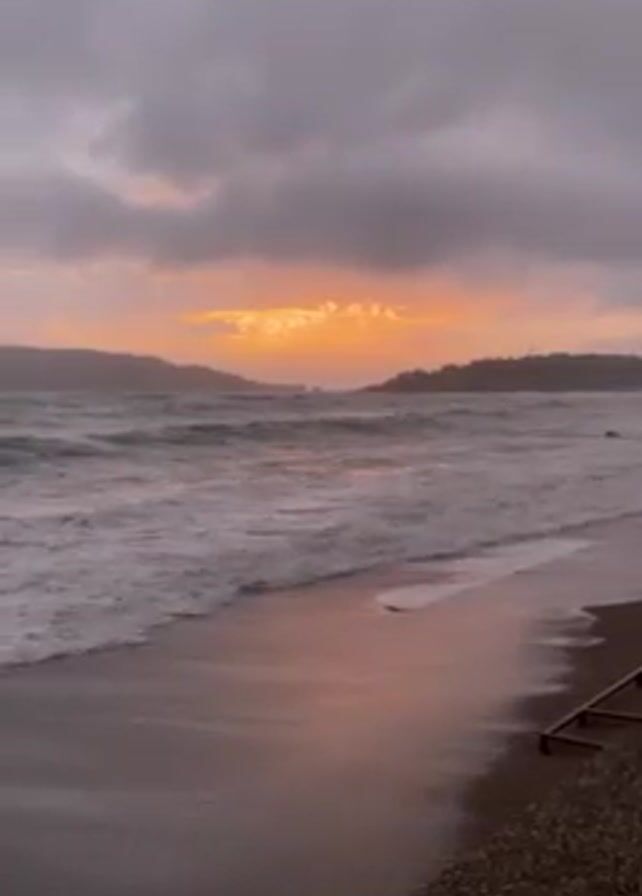 beach under a cloudy sky at sunset. The sky is a mix of gray and orange, with the orange glow of the setting sun peeking through the clouds. The ocean is choppy, with white waves crashing onto the sandy shore. The sand is wet and reflects the colors of the sky. A small section of a pebbled walkway is visible at the bottom right of the frame. At one point, a black and white dog briefly enters the frame.