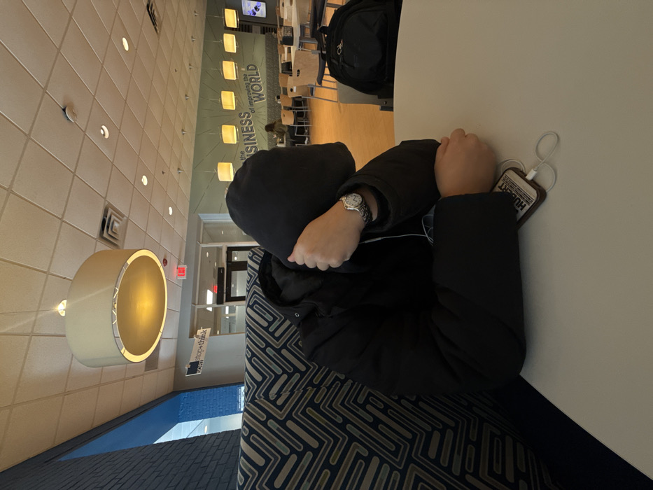 A person wearing a black jacket and hood sits at a table. The person's face is obscured by their arms. A watch is visible on their wrist. A phone connected to headphones sits on the table. In the background is a brightly lit cafeteria with tables and chairs. A wall with a sign reading "the BUSINESS of IMPROVING the WORLD" is visible. The person sits on a patterned couch. The image is rotated sideways.