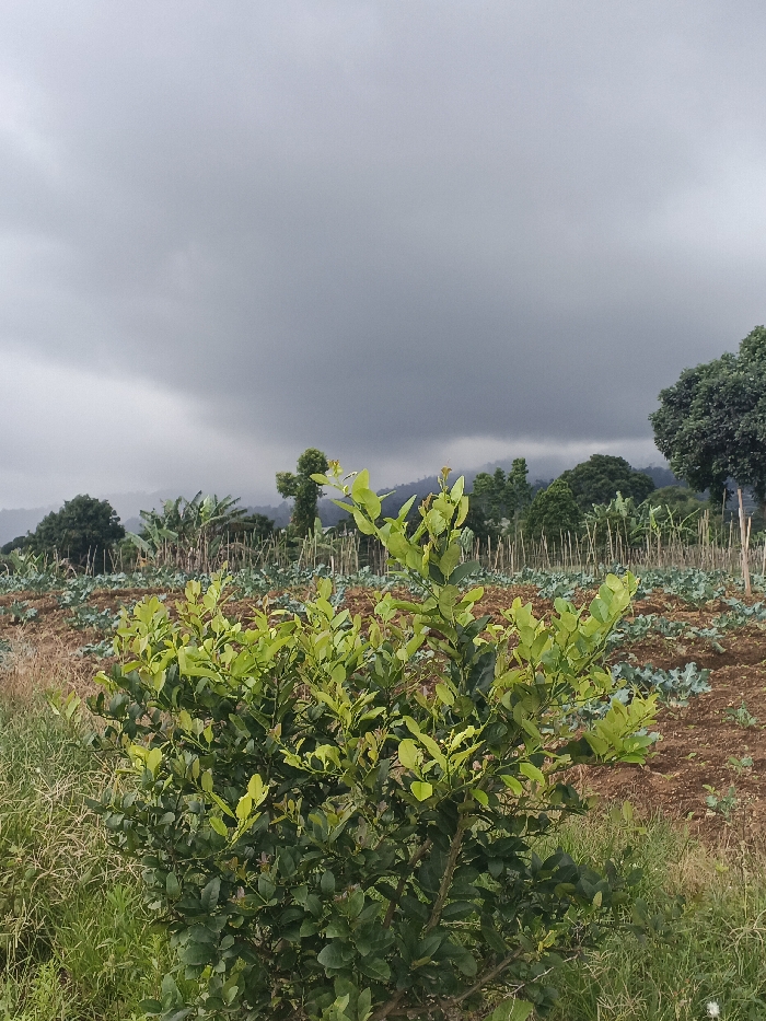 The image displays an agricultural landscape in Ngọc Tụ, Vietnam, under a dense, overcast sky. A prominent, lush green leafy bush, likely a citrus variety, occupies the lower central and right foreground, with wild green grass to its left. Immediately behind this bush lies a cultivated field of reddish-brown soil, showing rows of uniformly spaced green plants, possibly young brassicas. Numerous thin, vertical wooden stakes are distributed throughout this planted area. In the midground, various trees, including banana plants, stand beyond the cultivated rows. The background features distant mountains or hills partially obscured by atmospheric haze, beneath a sprawling expanse of dark grey, heavy cloud cover that dominates the upper two-thirds of the frame. No individuals, animals, or active events are visible.