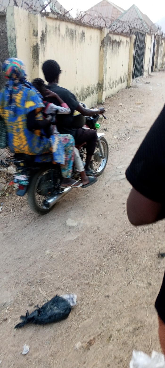 An unpaved dirt road in Nassarawa, Nigeria, serves as the setting for a daytime street scene. A motorcycle, moving from right to left, transports three individuals. The driver, an adult in dark clothing, operates the vehicle. A child in a light garment is positioned in front of a rear adult passenger. The rear passenger wears a vibrant blue, yellow, and multi-patterned traditional garment and a matching head covering, with feet in dark and white flip-flops. The motorcycle has a chrome exhaust and spoke wheels, with a bundle secured to the rear. To the right of the road, a weathered concrete wall topped with coiled razor wire extends along the street, featuring a dark metal gate further down. Building rooftops are visible beyond the wall. In the immediate foreground on the dirt road, a dark bag containing white material lies amongst scattered debris. The blurred arm and shoulder of an observer are partially visible in the lower right corner.
