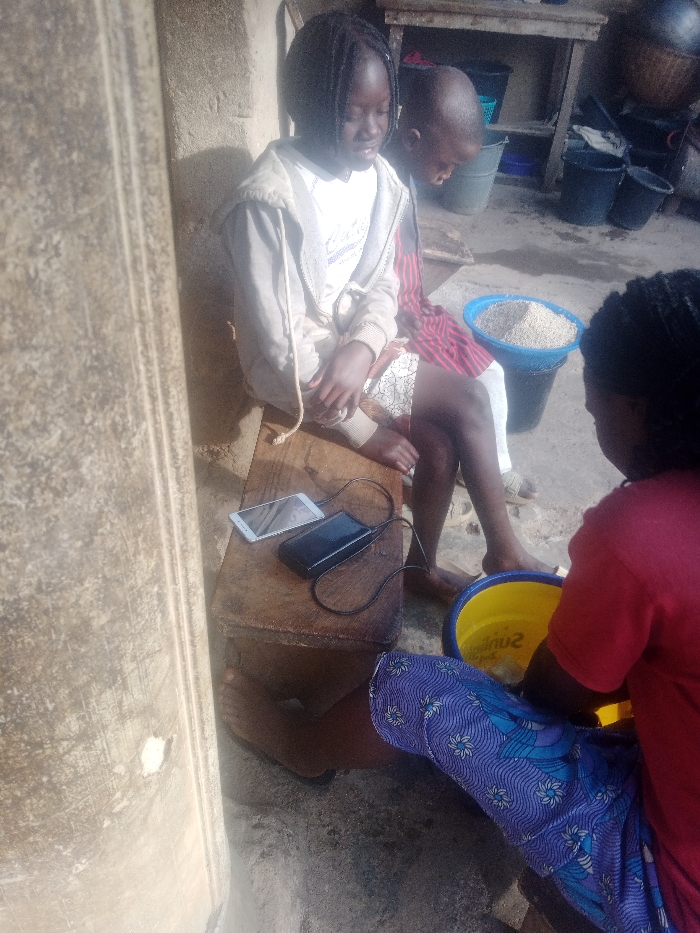 Three people sit outside near a concrete wall and floor. One girl with braided hair wears a white and tan hoodie, while another girl in a red shirt sits next to a bucket. A mobile phone rests on a wooden stool next to a black portable charger, connected by a cord. A third person in a patterned blue skirt sits on the floor near a yellow bucket, seemingly washing items. In the background, there are additional plastic buckets and a wooden shelf.