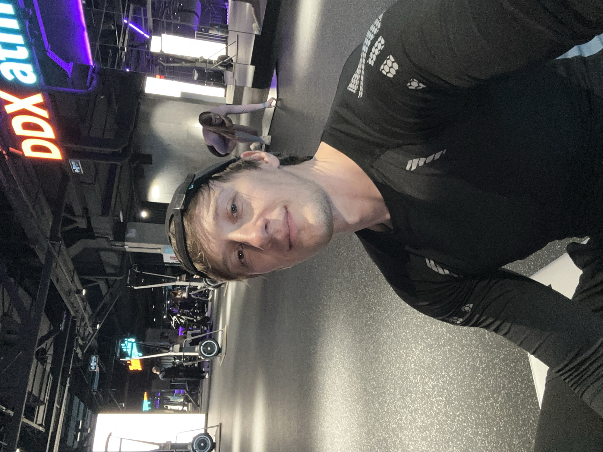 A selfie-style photograph shows a fair-skinned man with short blond hair, wearing a black long-sleeved athletic shirt, and a black headset