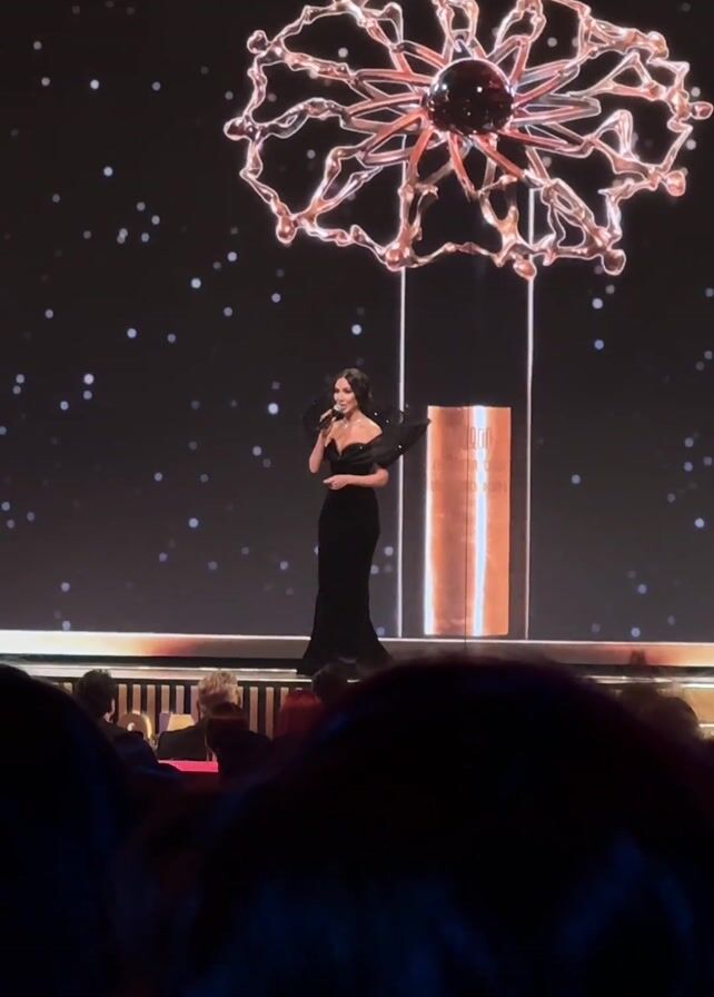 A woman in a black dress stands on a stage holding a microphone and talking to an audience