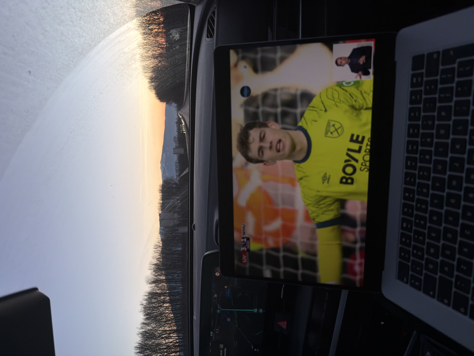 The image depicts the interior of a vehicle, looking out through a streaked windshield at dusk or sunset in Dolni Bogrov, Bulgaria. A multi-lane highway extends forward, flanked by bare deciduous trees on the left and mountains in the distance. The sky exhibits a gradient from light blue to orange-yellow at the horizon. Distant vehicle headlights are visible on the road. Inside the vehicle, a dark dashboard is visible, with a navigation screen displaying a map interface on the left. A silver-gray laptop rests in the foreground, displaying a soccer match. The laptop screen shows a male soccer player, likely a goalkeeper, wearing a yellow-green uniform with "BOYLE SPORTS" and a West Ham United crest. The score overlay reads "LIV 3 - 1 WHU." A smaller inset frame in the lower right of the laptop screen shows a male commentator or sign language interpreter gesturing.
