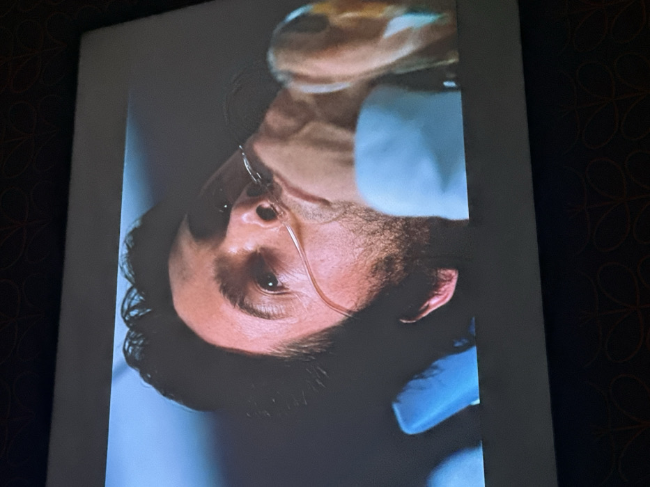 A close-up, upside-down image displays a man with an oxygen nasal cannula