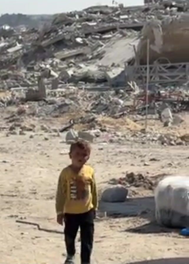 A young boy walks toward the camera in a devastated area. The boy is wearing a yellow long-sleeved shirt with black pants and white sneakers. Debris from destroyed buildings is piled up in the background. The ground is dusty and sandy. As the camera pans, a makeshift shelter and an Egyptian flag come into view. The sky is overcast.