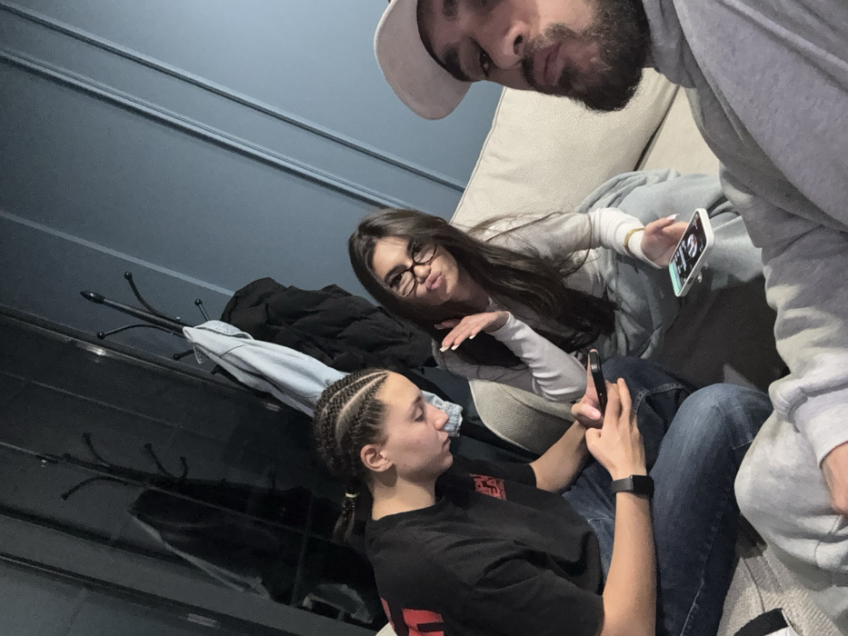 The image displays three individuals seated on a light-colored sofa within an indoor environment. On the left side of the frame, an individual with cornrow braids, wearing a black t-shirt and blue jeans, is observed looking down at a black smartphone held in both hands. A black smartwatch is present on their left wrist. Adjacent to them, a female individual with long dark hair and eyeglasses is seen looking directly at the camera with pursed lips, making a "kissing" face. Her right hand is slightly raised with fingers splayed. She wears a light-colored long-sleeved top and light-colored pants, partially covered by a blanket, and holds a white smartphone in her left hand. In the foreground on the right, a male individual is partially visible, wearing a white baseball cap and a light grey hooded sweatshirt, with a beard. This individual also looks towards the camera with pursed lips, suggesting they are capturing the selfie. The background features a dark surface on the left, reflecting a coat rack with clothing, and a plain, dark blue or grey wall on the right. The specific location within the city of Yerevan, Armenia, cannot be determined from the visual information provided.