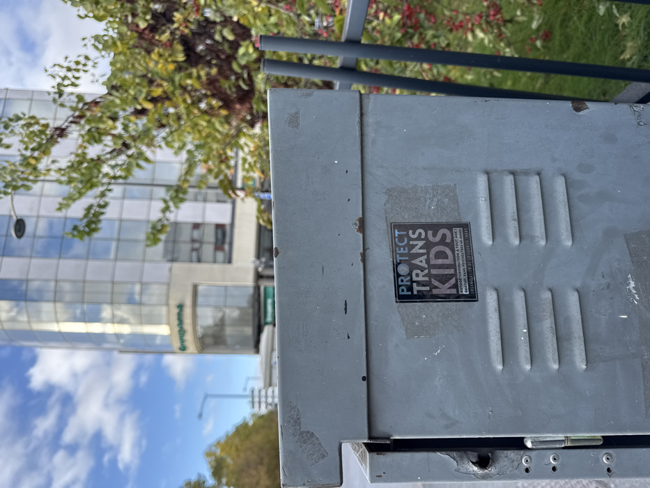The image presents a close-up, slightly low-angle view of a weathered grey metal utility box situated on a city street. The box, exhibiting scuffs, visible rust spots, and horizontal ventilation slits on its front face, features a hinged panel on its left side. A black and white sticker is affixed to the upper-central portion of the box, prominently displaying "PROTECT TRANS KIDS" in large white text, followed by smaller French text reading "AUTODETERMINATION À TOUT AGE ! GRATUIT, SANS PSYCHIATRES NI AVIS. ORGANISATION DE SOLIDARITÉ TRANS." To the right of the utility box, two vertical grey metal posts are partially visible, with green grass and red-berried foliage beyond them. The background is intentionally blurred, featuring a modern, multi-story building with a distinctive curved glass facade that reflects the partly cloudy blue sky. A green "Groupama" sign is visible on the lower section of this building, which is identifiable as part of Place Drouet d'Erlon in Reims, France. Green and autumnal trees are partially visible to the left and right of the building, and a street light fixture is discernible against the sky. No people are visible in the scene.