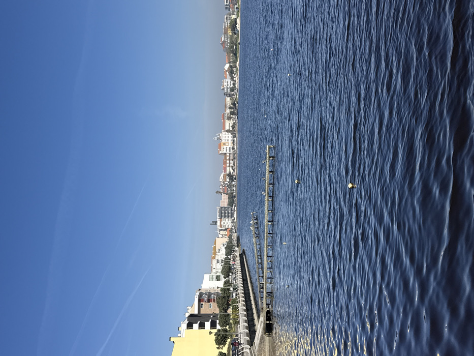 The image presents a daytime, panoramic view of the Barrinha de Mira lagoon in Praia de Mira, Portugal, under a clear, bright blue sky containing several faint white contrails. The lower half of the frame is dominated by the dark blue, rippled surface of the lagoon, within which several small yellow buoys are visible. Along the left shoreline, a curved, light-colored promenade with a white, ornate railing extends into the distance. Behind this promenade, a series of multi-story buildings are arrayed, featuring a prominent yellow structure on the far left, followed by white, grey, and other light-toned buildings. Trees and streetlights line the promenade, where several indistinct human figures are observed walking. Extending from the promenade's edge into the lagoon are at least three narrow, parallel wooden jetties. These jetties, along with the adjacent shallow water, are populated by numerous birds, predominantly white, consistent with gulls. The distant shoreline across the lagoon displays a continuous urban landscape composed of various buildings, indicating the extent of the town under bright sunlight.