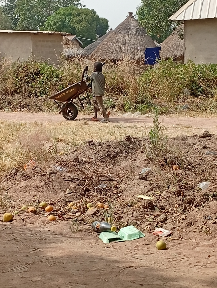 The image depicts an outdoor scene in Zaki Biyem, Nigeria, under daylight conditions. In the mid-ground, a young person, observed from behind, walks from left to right, pushing a dark-colored, single-wheeled wheelbarrow. The individual wears a light-colored long-sleeved shirt, trousers, and flip-flops. The wheelbarrow's side panel displays partially legible text. The foreground consists of dry, reddish-brown earth with sparse dry grasses and small green plants. Scattered debris on the ground includes numerous round fruits, varying from green to orange-yellow, a dark bottle with a yellow cap lying horizontally, and a light-green, open plastic container. The background features a dirt path bordered by dense, dry vegetation, including tall grasses and bushes. Visible structures include several traditional circular huts with conical thatched roofs and at least two rectangular buildings with light-colored walls and corrugated metal roofs. A blue fabric with white patterns is draped near one of the thatched huts. The sky appears light and hazy.