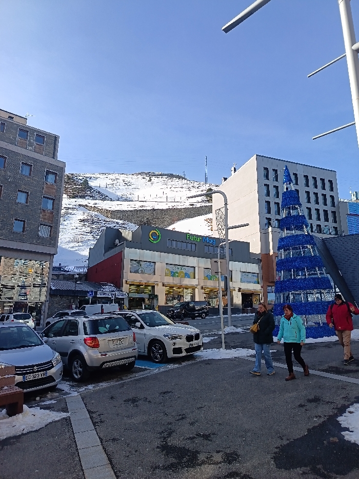 A street scene shows parked cars and pedestrians walking on the sidewalk next to a commercial building, likely a supermarket called "FUTUR MAG". A large, decorated blue Christmas tree stands nearby. In the background, a mountain partially covered in snow rises behind the buildings under a clear blue sky. The setting appears to be a town in a mountainous region, possibly a ski resort area.