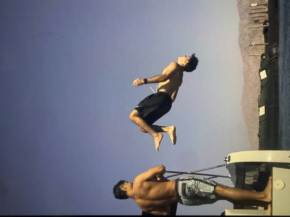 The image depicts two shirtless males on a boat, engaged in an aquatic activity, identified as taking place in Ness Ziona, Israel. On the left side of the frame, a male with dark hair and a muscular physique stands barefoot on the stern platform of a white boat, wearing light-colored swim trunks with a pattern. He is positioned facing slightly away from the camera, looking towards the right. To the right and center, a second male is captured in mid-air, performing a backflip or similar acrobatic maneuver over the water. This individual is shirtless, wearing dark swim shorts, and has a dark watch on his left wrist. His body is bent in a tucked position, with his head tilted backward. The background consists of a calm body of water, and beyond that, a distant shoreline with arid-looking mountains or hills under a clear blue sky. Some low-lying structures or vegetation are visible along the distant landmass.