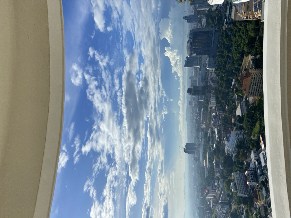 This image presents a high-altitude view of Pattaya City, Thailand, observed through a curved, light-colored architectural frame, likely a balcony railing or observation deck. The scene is illuminated by natural daylight under a sky displaying patches of bright blue interspersed with scattered white and light gray cumulus clouds. The urban landscape extends to the horizon, characterized by a dense concentration of buildings. These include numerous multi-story residential and commercial structures, some with visible terra cotta or light-colored roofs, alongside multiple modern high-rise towers and skyscrapers, several featuring reflective glass facades. A prominent dark-toned skyscraper with a visible construction crane at its apex is situated in the mid-distance on the left side of the frame. Another large, multi-story building featuring a distinctive, possibly curved or undulating roof design is visible in the mid-distance on the right. Substantial green spaces, consisting of dense tree clusters, are interspersed throughout the city's built environment. In the far background, a hazy range of mountains or hills is discernible along the distant horizon. No individuals or specific actions are depicted in the scene.