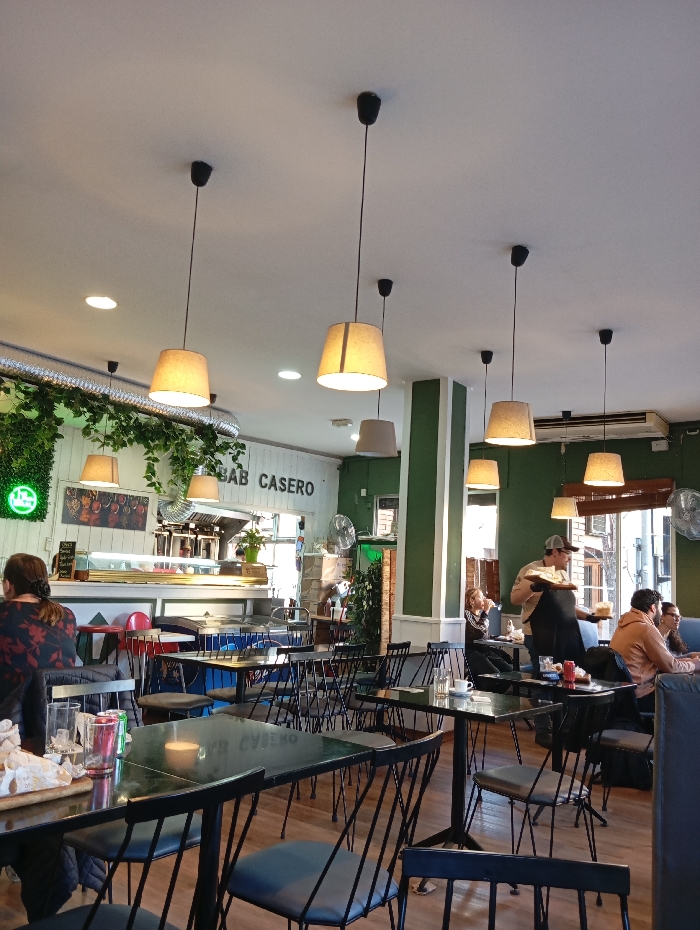 The image depicts the interior of a casual dining establishment, specifically the "Bab Casero" restaurant located in Cerdanyola Del Vallès, Spain