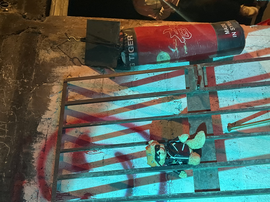 A red "Strong Tiger" punching bag, marked "Made in Syria," hangs near a weathered wall. Below it, a metal grate casts striped shadows. Resting on the grate is a stuffed animal, seemingly abandoned or lost. The scene is bathed in a blue light with red accents, creating a slightly unsettling atmosphere.