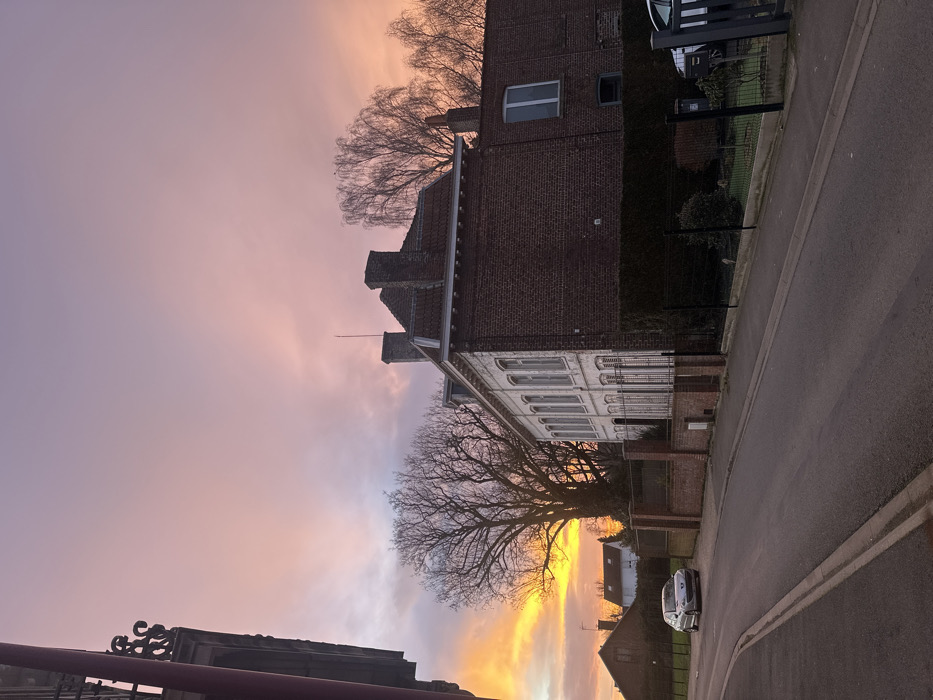 A dusk view captures a street scene. A stately brick building with white trim stands alongside a road. A tall, bare tree branches out against a pink and orange sky, casting a silhouette. A couple of cars are parked by the side of the road. A dark wrought iron fence partially frames the image's left edge.