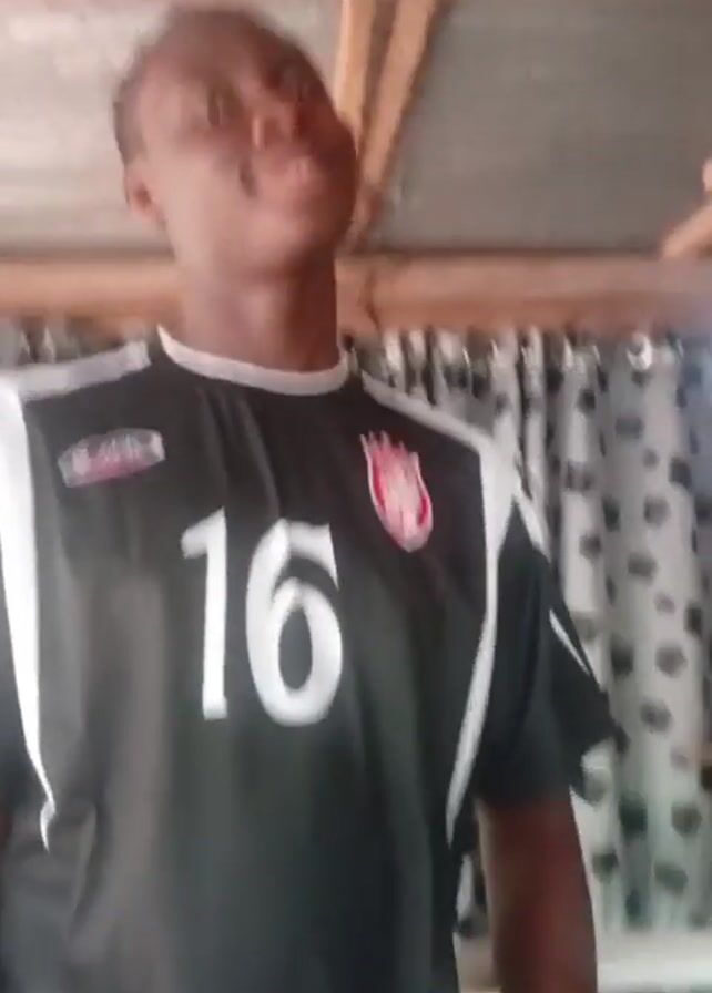 young man wearing a black and white soccer jersey with the number 16 on it. He is standing indoors, possibly in a simple house, as evidenced by the corrugated metal ceiling and wooden beams. Behind him, there is a curtain with a black and white pattern. The man looks towards the camera, opens his mouth in an excited expression, and then makes a slight, pursed-lip gesture, ending with a more neutral expression. The lighting is somewhat dim but sufficient to see the person and surroundings clearly.
