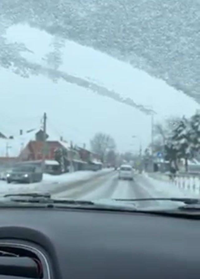 The view from inside a car looking out onto a snow-covered street in a residential area. The windshield is partially covered in a layer of snow and ice, with the cleared section revealing a street lined with houses and trees, all covered in snow. Several cars are visible on the road. The sky is overcast and gray, and the overall impression is of a cold, snowy day. The car is moving forward, as evidenced by the changing scenery.