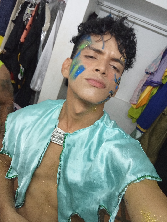 A young man with curly dark hair and face paint poses for a selfie. The paint is blue and green streaks on his forehead and a butterfly design on his cheek. He is shirtless, wearing a light blue, satin-like cape with a jeweled clasp. Gold glitter is visible on his body. The background features a cluttered room with clothing hanging. His expression is serious.