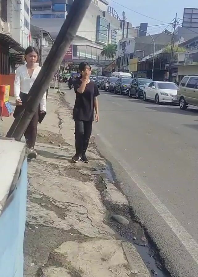 two women walking along a sidewalk in what appears to be an urban area. The first woman is wearing a white jacket and brown pants, while the second woman is wearing a black shirt and black pants. They are walking on a sidewalk with a few cracks and patches. A street with several cars parked along the side runs parallel to the sidewalk. There are buildings in the background, including a multi-story building with visible glass windows. A utility pole is visible in the foreground, partially obstructing the view. The weather appears to be sunny.