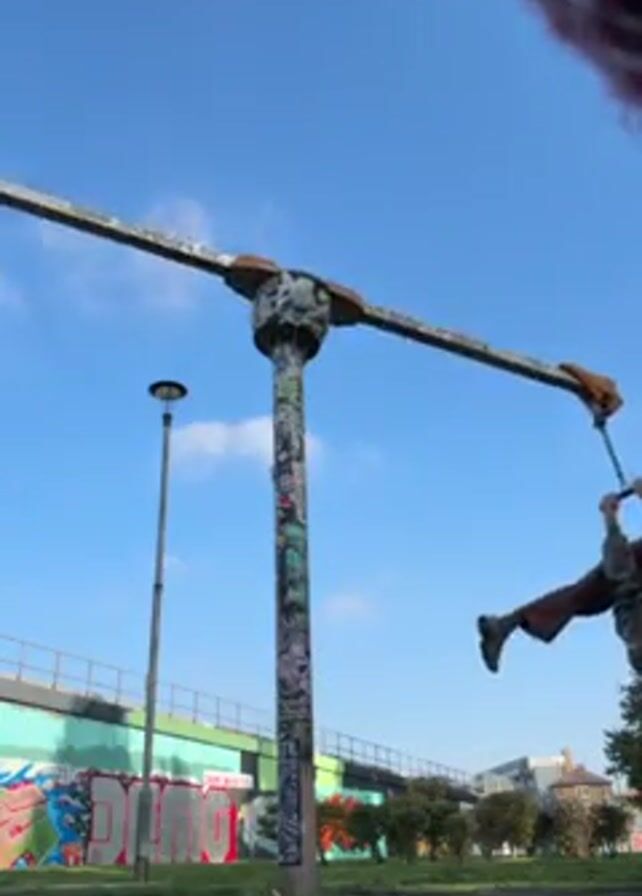 A stationary swing set in a park is the focus of the video, with two individuals taking turns using it
