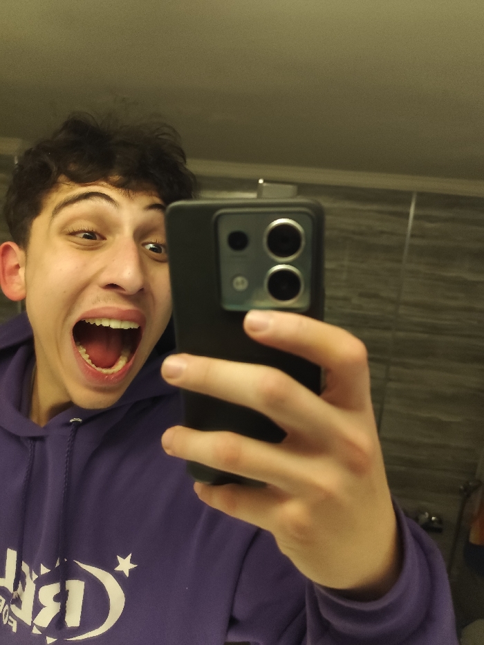 A young man takes a selfie in a bathroom. He wears a purple hoodie with a white graphic, his mouth is wide open. His dark curly hair contrasts with the neutral tones of the tiled wall behind him. He’s holding a black smartphone, the dual camera lenses visible.