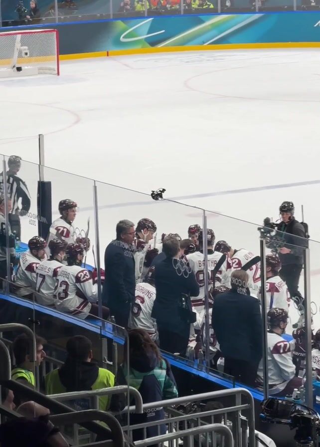 hockey team gathered in their bench area, surrounded by a glass barrier. Players in maroon and white jerseys huddle together, some holding hockey sticks. Several men in suits stand with them, likely coaches or team officials. One man’s jacket displays the Olympic rings logo. Spectators are visible in the foreground and background, seated in the stands. A referee in a striped uniform stands nearby, overseeing the scene. The hockey rink is visible beyond the bench, with the goal net at one end. A camera is positioned outside the bench, capturing the huddle. The environment suggests a professional or high-level hockey game.