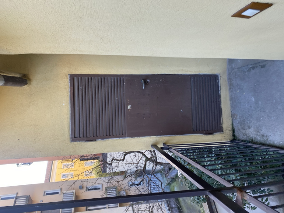 The image depicts a residential balcony view in the city of Milan, Italy, overlooking an internal courtyard and adjacent buildings. In the foreground, a concrete balcony floor, partially covered in dirt and moss, extends to a dark metal railing with vertical bars. To the right, a weathered dark brown utility door is set into a pale yellow stucco wall. The door features an upper section with horizontal louvers and a lower solid panel, equipped with a dark, horizontal handle on the right side. Above the door, a vertical downspout runs along the corner of the building. On the adjacent pale yellow wall to the right, a small, diamond-shaped wall-mounted light fixture with a white insert is visible near the bottom. Beyond the balcony railing, dense green foliage grows in the courtyard below. A bare deciduous tree with intricate branches occupies the midground, suggesting a non-summer season. A blue fence or gate is partially discernible behind the tree. In the background, several multi-story residential buildings are visible under a bright sky. The building on the far left is light-colored with multiple balconies featuring metal railings. A distinct yellow building with visible windows stands further back in the center. No individuals or active interactions are present in the scene.