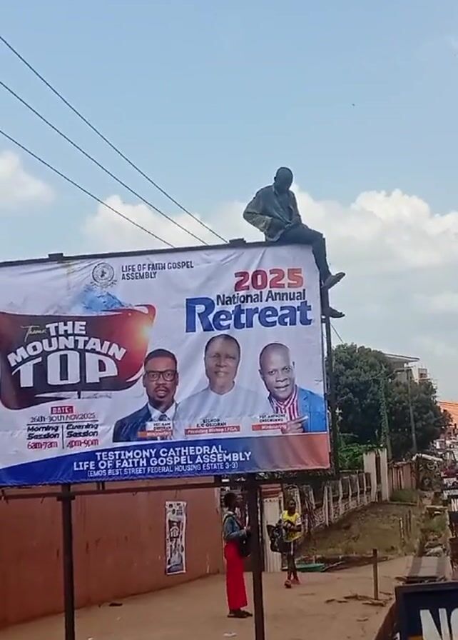 man sitting on top of a large billboard. The billboard advertises the "2025 National Annual Retreat" for the "Life of Faith Gospel Assembly." It features portraits of three men and details about the event. Below the billboard, there are a few pedestrians walking along the sidewalk. The street appears to be in a populated area, with buildings and vehicles visible in the background. Overhead, there are power lines. The sky is partly cloudy. The person on the billboard is wearing dark clothing.