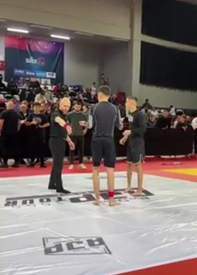 two fighters and a referee on a mat, getting ready to start a fight, in front of a crowd of people. The fighters are both young men, wearing athletic shorts and tops, and are barefoot. The fighter on the left appears taller than the fighter on the right. The referee is a man wearing a black uniform. They are standing in the center of a white mat that is bordered by red, gold, and yellow. The mat has black lettering on it. The background shows a large audience seated in bleacher-style seating, partially obscuring large banners and posters, as well as some architecture and infrastructure. The lighting is bright.