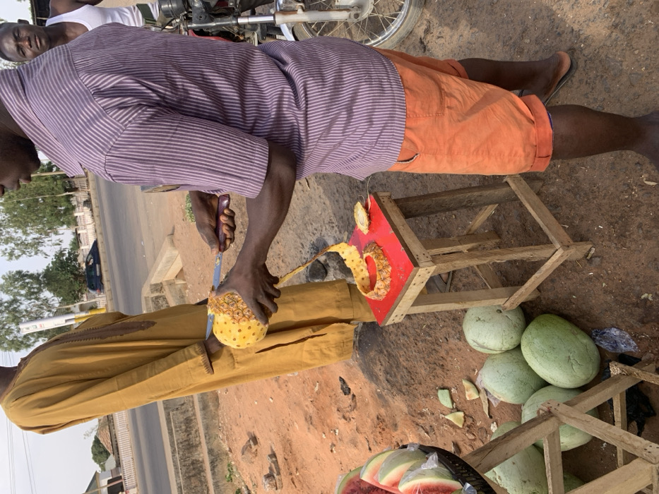 A man peels a pineapple with a knife next to a red cutting board on a wooden stool. Another man stands nearby. The ground is reddish-brown. A basket of sliced watermelons and a pile of whole watermelons are visible. The scene appears to be a roadside market. A street with buildings and a vehicle are in the background.