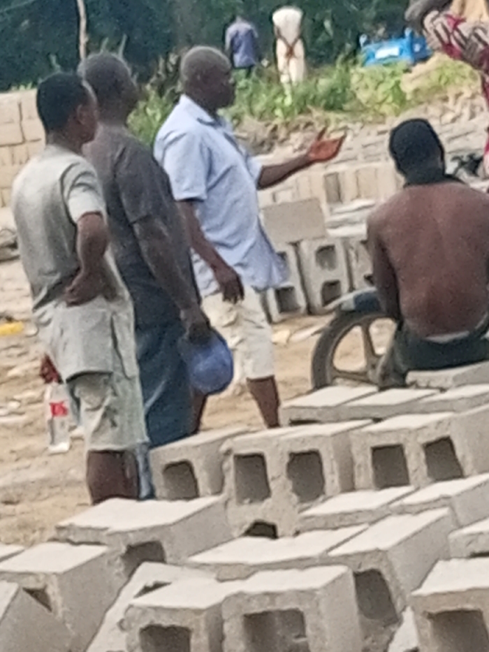 An outdoor scene in Adankolo, Nigeria, depicts five adult males and numerous concrete hollow blocks on dusty ground