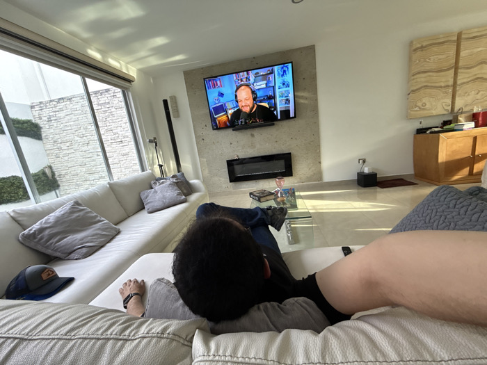 The image depicts an indoor residential living room in Santa Clara Ocoyucan, Mexico, brightly illuminated by natural light. One individual is partially visible, primarily from the torso and legs, reclining on a light-colored (likely white or off-white) sectional sofa in the foreground. The person has short, dark, curly hair, wears a dark top, and a dark smartwatch is visible on their left wrist. Their legs are extended and partially covered by a gray textured throw blanket, resting on the sofa. The individual is oriented towards a flat-screen television mounted centrally on a light gray, textured accent wall, possibly concrete or stone veneer. The television displays a male subject with a beard, wearing headphones and a dark shirt, against a background featuring shelves and various objects. Below the television, a black, linear electric fireplace is recessed into the accent wall. A clear glass coffee table is positioned in front of the sofa, holding a book, a wine glass containing a pink liquid, and other small, indistinct items. To the left of the main sofa section, a dark blue and gray baseball cap rests on an armrest. To the right of the accent wall, against a white wall, stands a light-toned wooden cabinet or credenza, topped with various objects. Above the cabinet, a large abstract artwork in beige and brown tones is mounted. A tall, slender black floor-standing speaker is visible to the right of the television. Large windows along the left wall allow natural light to stream in, casting distinct rectangular shadows onto the light-colored tiled floor. Outside the windows, a light-colored stone or brick wall and sections of manicured green foliage are visible. The room exhibits a modern and clean aesthetic.