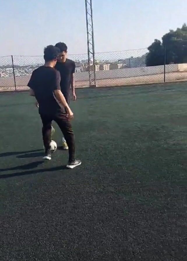 Two young men are on an outdoor artificial turf field. They are both wearing black shirts and black pants or shorts. One of them has a soccer ball and is dribbling it. The other tries to steal the ball, and they briefly collide. The one who had the ball throws his hands up in the air, as if surprised, and the other continues to dribble the ball away. In the background, there is a chainlink fence, some buildings, and a tall metal structure, perhaps a light pole. The sky is clear and blue.
