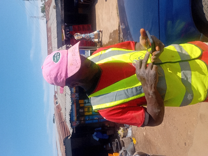 An adult male is prominently featured in the foreground, facing slightly right and looking down at a smartphone. He wears a red t-shirt, a yellow and grey high-visibility safety vest, and a faded pink baseball cap with a green oval patch bearing "Don't stop, keep going" text. His dark-skinned hands, appearing somewhat soiled, are actively engaged with a black smartphone held horizontally in his left hand, while his right index finger touches the screen. A small, clear object is held between his left thumb and forefinger, possibly attached to the phone. The scene is set outdoors under a clear blue sky, indicative of bright daylight conditions. Behind the man, a bustling commercial street or market area in Jos, Nigeria, unfolds. Structures with rusted corrugated metal roofs line the background. One visible stall features blue-painted walls and red crates, with a partially obscured banner displaying "FOR PROGRESS." Various items and containers are scattered on the dusty ground near these establishments, suggesting goods for sale. A woman in a patterned dress walks in the mid-ground to the right, and a dark blue vehicle is partially visible on the right side of the frame.