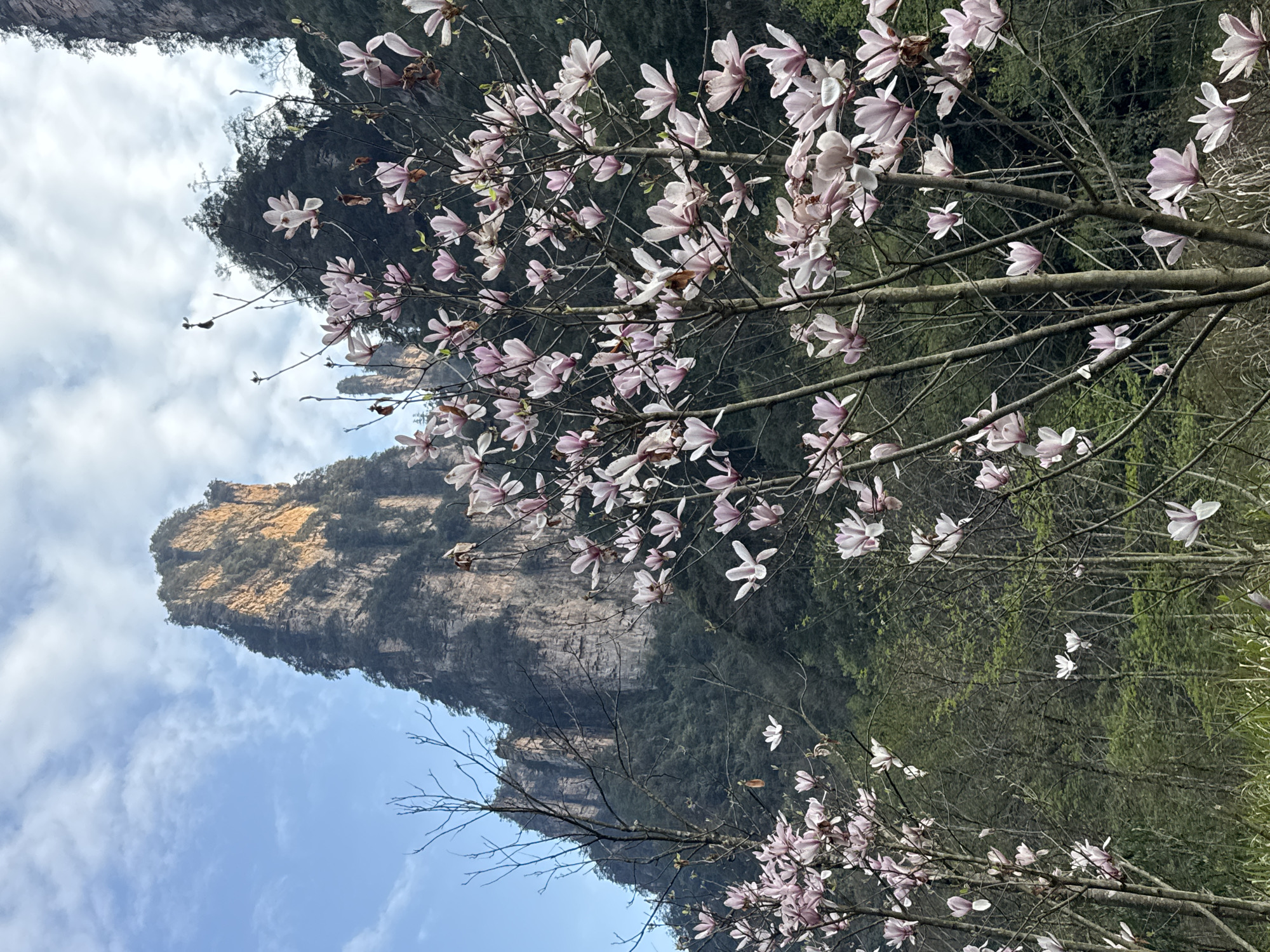 The image presents a natural landscape within the Wulingyuan scenic area of China. In the foreground, multiple magnolia trees are prominently displayed, densely covered with open light pink and white blossoms. Their branches are largely bare of leaves, indicating an early spring season. The immediate ground level shows green grass and sparse vegetation. The midground transitions to a dense, dark green forest covering the lower slopes of steep mountains. In the background, towering sandstone pillars, characteristic of Wulingyuan, dominate the skyline. The largest pinnacle, centrally positioned, features an upper section brightly illuminated by sunlight, giving it a golden-brown hue, while its lower rock face is in shadow. Additional, darker pinnacles are visible further in the distance. The sky above is blue with scattered white clouds. No individuals, animals, or man-made structures are visible.
