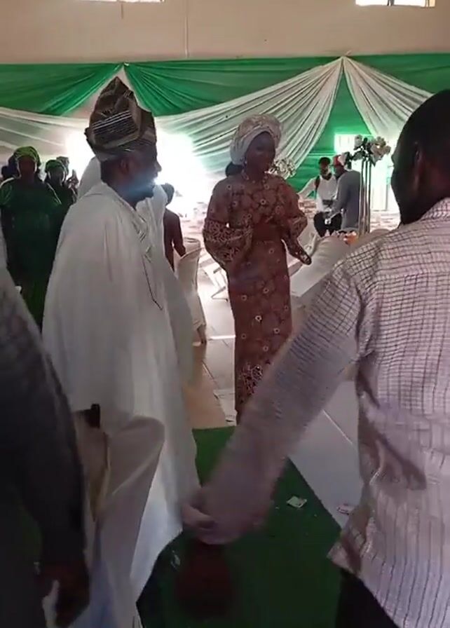 room decorated for an event. Three windows let light into the room. Green and white fabric is draped as decorations. Several people are present, including a man wearing a white robe and hat, a woman in a patterned brown dress and head wrap, and a man in a striped shirt. The woman stands on a green carpet, interacting with the man in the white robe. Chairs are arranged around the room. There appears to be music playing. Someone is filming the scene.