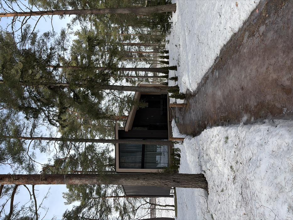 The scene depicts a modern, dark-clad cabin situated in a snow-covered pine forest environment in Kerro, Russia. A winding, partially thawed path, consisting of exposed earth and residual ice, leads from the foreground towards the cabin. The path is bordered by melting snow on both sides. Tall, slender pine trees dominate the landscape, their green needles visible against a light, possibly overcast, sky. The two-story cabin features prominent vertical glass window panels on its visible facade, framed by a light-colored trim. Its exterior walls appear to be dark wood or composite material, and the roof has a contemporary angled design with a light trim. The cabin is elevated slightly on stilts, revealing a space underneath. A small wooden porch or deck extends from the front of the cabin, where a dark outdoor bench or seating arrangement is visible. A row of small, conical evergreen shrubs lines the base of the cabin's porch. Two short, rustic wooden posts mark a section of the path near the cabin, with a small green sign attached to one, text obscured. To the left of the cabin, a frozen or snow-covered body of water, likely a lake, is visible through the trees in the distance. No individuals or active events are present in the image.