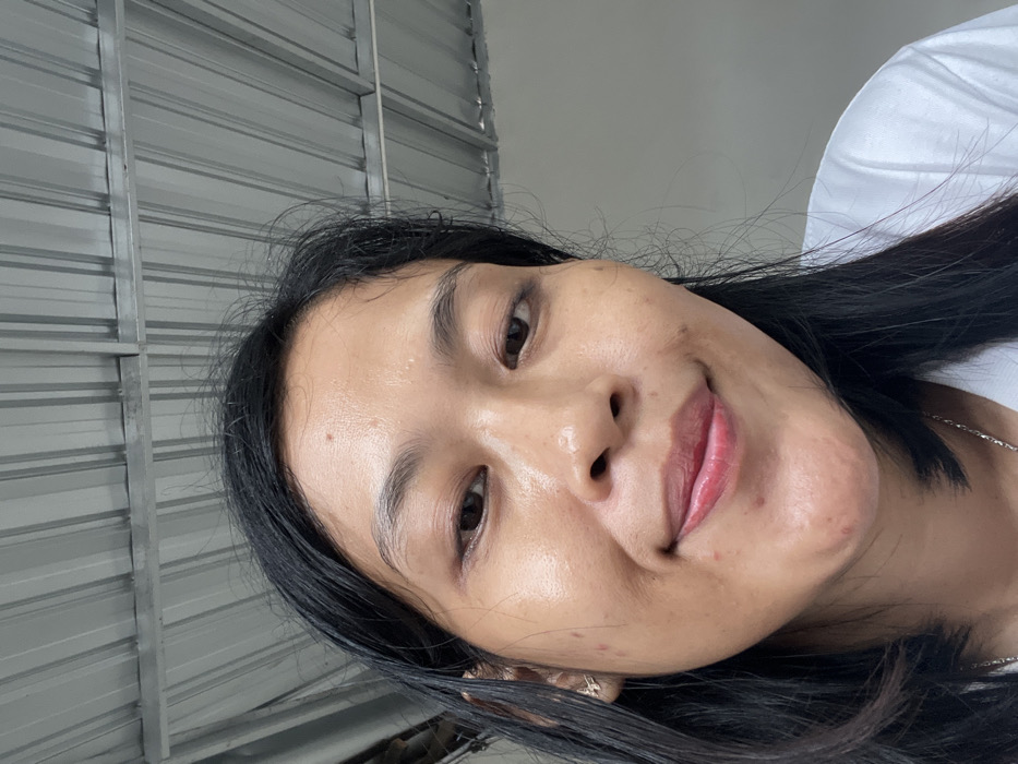 A young Asian woman poses for a close-up selfie, tilted to the left. She has dark hair, smooth skin with slight blemishes, and is wearing a white top. The background features a corrugated metal wall or ceiling. She is smiling softly, showcasing her full lips and slightly squinched eyes. The overall lighting is bright and even, highlighting the natural tones of her face and the textures of the surrounding environment.