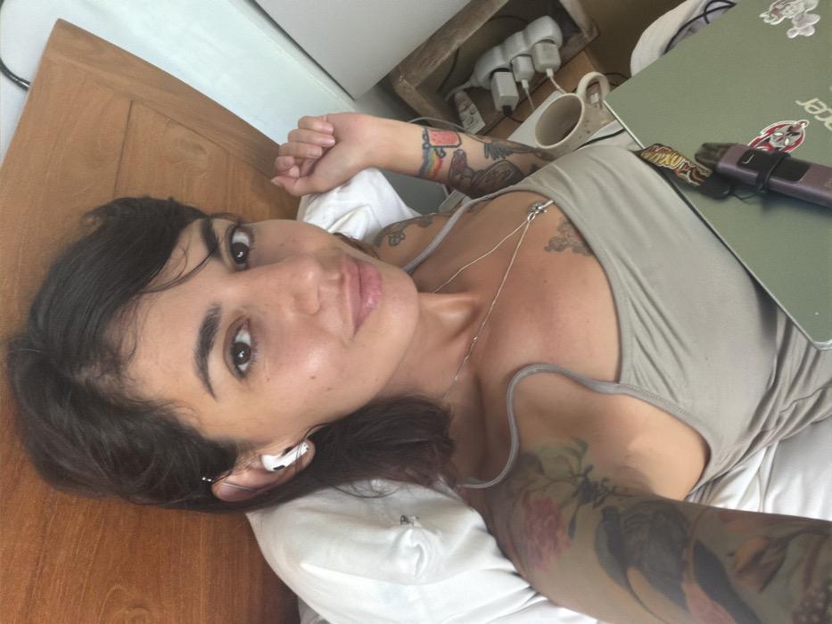 A female individual is depicted in a close-up, chest-up view, lying down on a bed in what is identified as Nusa Dua, Indonesia. She has dark, short hair and brown eyes, looking directly at the camera with a slight smile. A white earbud is visible in her left ear, along with a metal ear cuff. She wears a light-colored spaghetti-strap top and a silver-colored necklace with a small pendant. Both arms and her upper chest are extensively tattooed with various designs, including flowers, a bird, a watermelon slice with a rainbow, and other intricate patterns. A light green Acer laptop, adorned with multiple stickers, rests on her lap/chest, with a dark-colored vape device clipped or strapped to its cover. Her left hand is partially visible, resting on a white pillow. The background features a light brown wooden headboard or wall panel. To the right, a white wall or furniture piece is visible, along with a wooden nightstand. On the nightstand, a white multi-outlet power strip with several white power adapters is plugged in, alongside a light-colored mug. The bed is covered with white sheets and a white pillow.