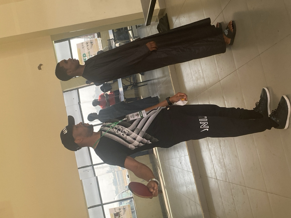 An indoor scene, likely a multi-purpose hall, in Unguwar Sarki, Nigeria, features two men in the foreground and several blurred figures in the background. The man on the left, with dark skin and a beard, wears a black baseball cap with "44 NGN" text, a black t-shirt with a white geometric design, black tracksuit bottoms with "ONI" text, and black sneakers with white soles. He holds a red table tennis paddle in his right hand and has a green lanyard with an ID card around his neck. A small white object is visible in his left hand. He is positioned facing right. To his right, a second man with dark skin, clean-shaven, wears a long, dark traditional robe and black slides. He stands upright, also facing right, with his hands not visible. The floor is covered with light-colored square tiles. The room's background features large, clear glass windows that extend across the width of the frame, revealing an outdoor area under daylight. Through the windows, blurred vehicles, structures, and posters with partially legible text such as "KD" and "KP" are visible. Inside, in the mid-background, obscured figures, including one wearing a red shirt, are present near what appear to be tables. The ceiling is a plain light color, with a minor circular imperfection near the top center. Natural light illuminates the scene from the windows.