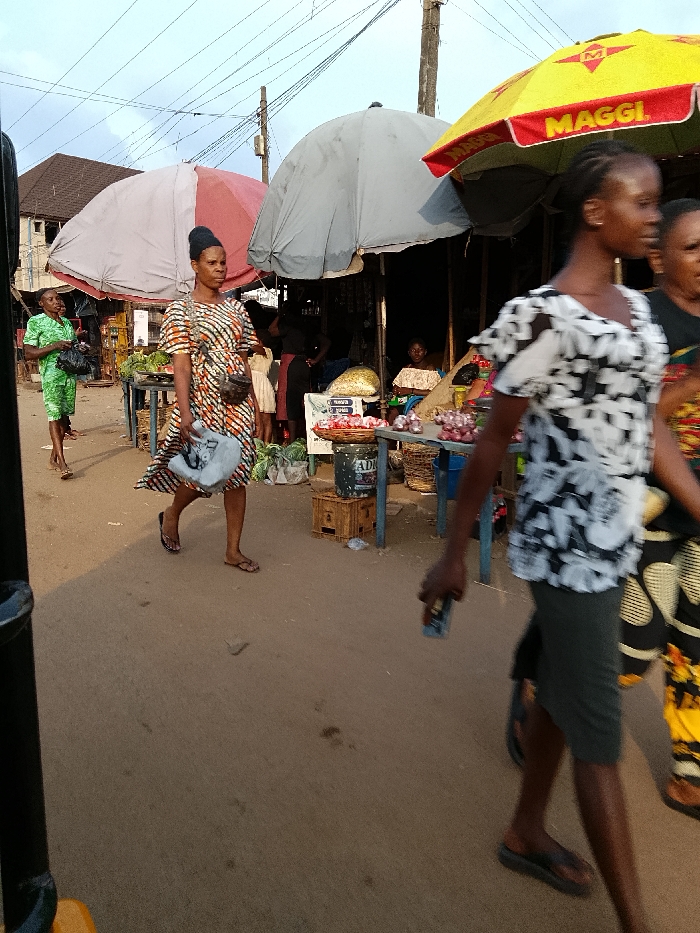 A street scene depicts people walking past market stalls covered by large umbrellas. One woman in a patterned dress carries bags, while another in a black and white top walks alongside someone in a yellow patterned skirt. Vendors sit at their stalls, displaying produce like tomatoes and onions. Power lines crisscross above, adding to the busy, everyday atmosphere of the outdoor market.