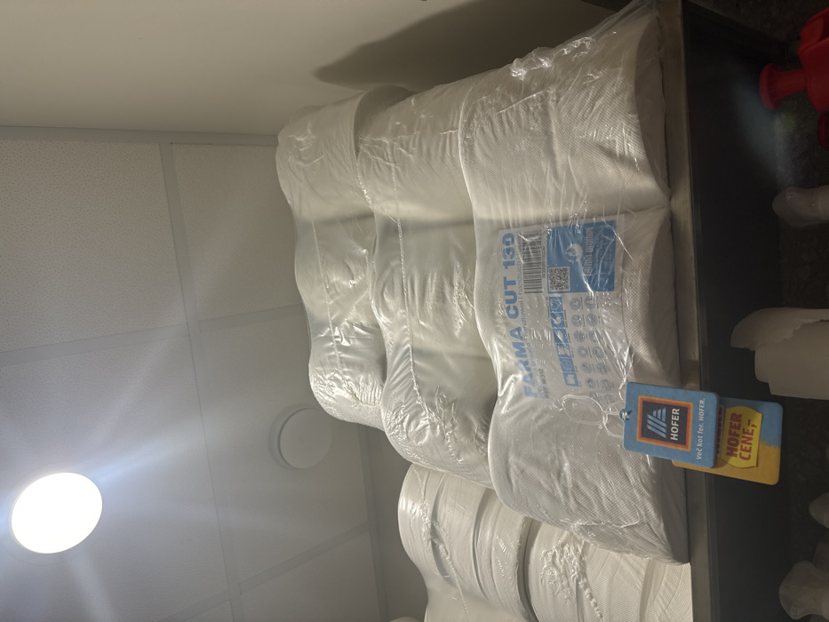The image depicts an indoor storage or retail area, showcasing multiple bundles of white paper products stacked on a dark-colored shelf. Each bundle consists of several individually plastic-wrapped rolls, further enclosed in clear plastic. The frontmost bundle features a label reading "FARMA CUT 130" and "Papirnate brisalce Handtowel Handtücher," along with a barcode and QR code. Attached to this bundle are two hanging price tags: an upper blue tag displaying the "HOFER" logo and the Slovenian text "Več kot fer. HOFER.", and a lower yellow tag marked "HOFER CENE". These labels indicate the products are consistent with items sold at a Hofer supermarket within Slovenia. The specific location within Radovljica, Slovenia, cannot be forensically confirmed from the image itself. The overhead environment consists of a white suspended acoustic tile ceiling with grid lines and two circular flush-mounted light fixtures, one of which is brightly illuminated. A plain, light-colored wall is visible on the right side of the frame. A lower shelf, partially visible beneath the main display, holds indistinct white objects and a red plastic item, possibly a container. No individuals are present in the scene.