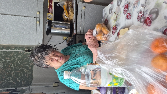 An elderly woman, with short, curly, graying hair and wearing a teal-patterned top, is seated at a table in a kitchen located in Kamennyi Kliuch, Russia