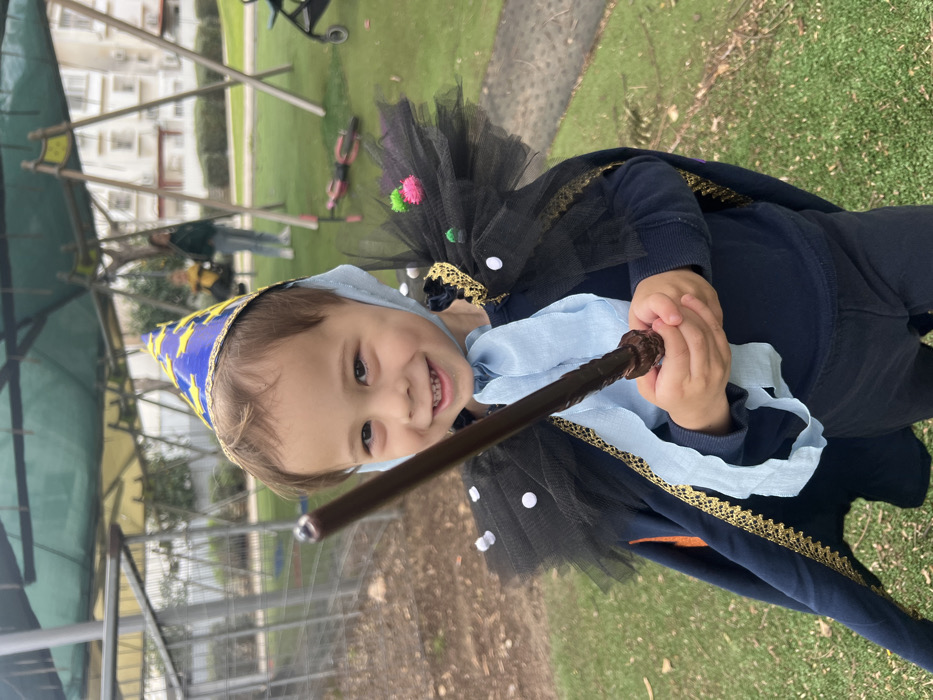 The scene depicts a young child in an outdoor park or playground in Kiryat Bialik, Israel. The child, positioned centrally and facing forward, wears a costume consisting of a blue conical hat with yellow stars and gold trim, a light blue fabric draped around the neck, a dark blue long-sleeved shirt, dark pants, and a black cape adorned with gold trim, white polka dots, and small multi-colored pom-poms. The child holds a dark brown, wand-like object with a spherical tip in both hands, extending it forward, and displays a direct smile towards the viewer. The ground under the child is a mix of dirt and small gravel, transitioning to green artificial turf. In the background, a green/tan shade canopy structure is visible overhead, supported by wooden poles. A metal fence is present behind the child, and further back, out of focus, are playground elements including a wooden swing set. Two indistinct adult figures are visible in the mid-ground near the swing set. A collapsed pink and black scooter and a black stroller are on the artificial turf to the right. Residential buildings are present in the distant background.